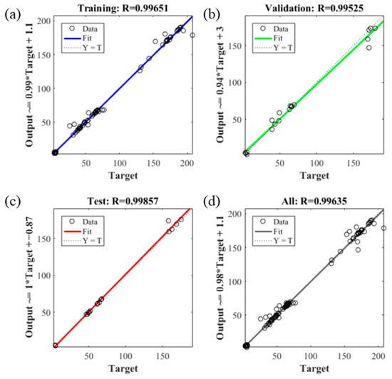Figure 8 shows the performance of the optimal ANN model, indicating that the ANN model prediction exhibits good correlation with experimental results in training (R = 0.997), testing (R = 0.999), validation (R = 0.995) and whole (R = 0.996) datasets. The training convergence curve for the optimal ANN model is given in Figure 9. In the training stage of the ANN model, it is observed that the MSE decreases with the increasing number of iterations and reaches the error goal at about 120 epochs. Therefore, the well-trained ANN model has robust generalization ability.