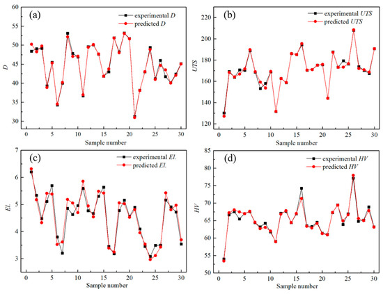 The comparisons between the experimental and the predicted results for the entire datasets. (a) D, (b) UTS, (c) El. and (d) HV.