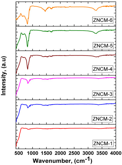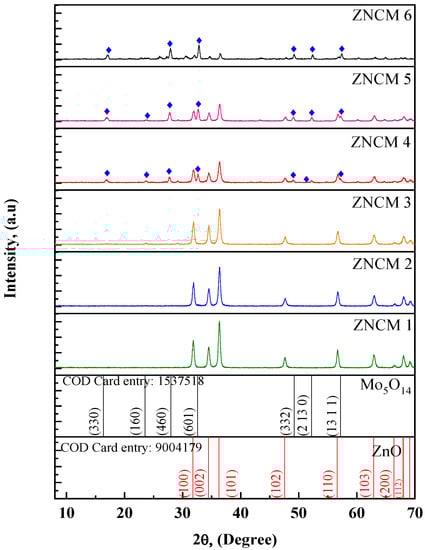 The X-ray diffraction patterns of pure (ZNCM-1) and Mo-doped (ZNCM-2, ZNCM-3, ZNCM-4, ZNCM-5, and ZNCM-6) ZnO nanoparticles samples are demonstrated in Figure 1. The diffraction peaks of the ZNCM-1 sample matched with hexagonal ZnO structure. These peaks were indexed according to COD Card entry 9004179. We did not find any significant Mo or Zn residues from the XRD patterns of ZNCM-2 and ZNCM-3 samples. It indicates that Mo replaces Zn in the hexagonal ZnO lattice. Similar results were obtained for Mo and Al-doped ZnO and Mo-doped In2O3 films [31,32,33,34,35,36,37,38,39]. Further, the intensity of all the ZnO peaks decreased, whereas the intensity of Mo-based Mo5O14 peaks increased with an increase in dopant concentration observed in the XRD pattern of ZNCM-4, ZNCM-5, and ZNCM-6 samples. The peaks corresponding to Mo5O14 are indexed according to COD Card entry 1537518. K. Ravichandran et al. [1] reported similar results. The unit cell parameters of hexagonal ZnO calculated from the XRD pattern were a = 3.2 ± 0.2 Å and c = 5.2 ± 0.2 Å, indicating independence of dopant concentration of the samples. Scherer’s formula was used to calculate crystallite size (D), dislocation density (δ), and dislocation density (δ), using the following relationships [21,22]: