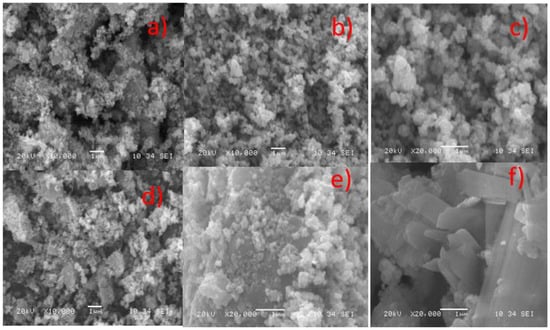 Figure 2. SEM images (a) ZNCM-1, (b) ZNCM-2, (c) ZNCM-3, (d) ZNCM-4, (e) ZNCM-5, and (f) ZNCM-6.