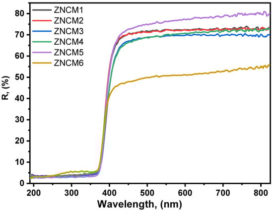 The Optical Diffuse Reflectance (ODR) spectroscopy is a specialized optical technique for determining the electronic structure of nanostructured materials. Reflection from the loaded samples generated by diffuse illumination is well studied because of its non-destructive nature and ability to generate a mirror-like reflection from loaded samples. To determine the optical bandgap and absorption coefficient of semiconducting material, the ODR technique is used. ODR of undoped and Mo-doped ZnO nanoparticle samples as a function of light wavelength in the range of 200–800 nm are shown in Figure 3. To summarize, the optical bandgaps are produced by the absorption of light through the nanomaterial; the optical energy band gap was calculated using the Kubelka–Munk model [42], which is as follows: