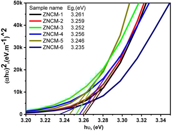 where h is the photon energy, ¦Ô is the photon frequency, h is Planck’s constant, and A is the band tailing factor, has values ranging from 1 × 105 to 1 × 106 cm−1·eV−1. The optical transition (n) values equal 1/2 for the direct bandgap, and the plots (optical band) are shown in Figure 4. The reflectance spectra of all samples were found to be identical in the wavelength range of 200–370 nm. The optical bandgap of the samples was revealed by a sharp increase in the ODR spectra between 370 and 410 nm. In the visible region of 410–800 nm, all ZnO nanoparticles have a high reflectance. ZNCM-1, ZNCM-2, ZNCM-3, ZNCM-4, ZNCM-5, and ZNCM-6 have estimated band gap values of 3.261, 3.259, 3.252, 3.256, 3.246, and 3.235 eV, respectively. E.g., values decrease as Mo-doping concentration increases, which could be due to new energy states between the valence and conduction bands. C. Aydn et al. [43] obtained comparable results for sol-gel prepared ZnO: Fe nanoparticles. ZnO nanoparticles have high reflectance values in the visible region that decrease as dopant concentration increases, indicating that these samples are suitable for electrocatalytic applications under visible light irradiation. Similar decreasing band gap values were observed by Peyman Gholami et al. (2019) [44] on biochar-supported ZnO nanorods in the degradation of Gemifloxacin.