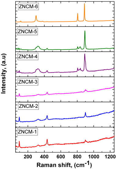 Figure 5 depicts the Raman spectra of pure and Mo-doped ZnO samples. Wurtzite ZnO is an associate of the C6V (P63mc) space group, and its possible vibrational modes [6,37] include U opt = A1 + 2B1 + E1 + 2E2. A1, E1, and E2 are Raman active, while B1 is Raman prohibited. The Raman peaks are observed at 95cm−1, 328, 431, 808, 843, and 903 cm−1, corresponding to E2 low, E2H–E2L, E2 high, E2 low + A1 (TO), E2 high + A1 (TO), and A1 mode, respectively. These findings corroborated previous findings [7,45,46,47,48,49]. A1 and E1 are polar modes that are both infrared and Raman active, whereas E2 is non-polar and only Raman active. E2 high is the peak at 431 cm−1. Wurtzite ZnO’s characteristic peak indicates good crystallinity [50]. The intensity of the E2 high mode decreases as dopant concentration increases, whereas the intensity of the A1 mode increases.
