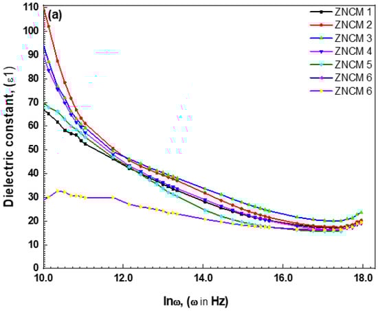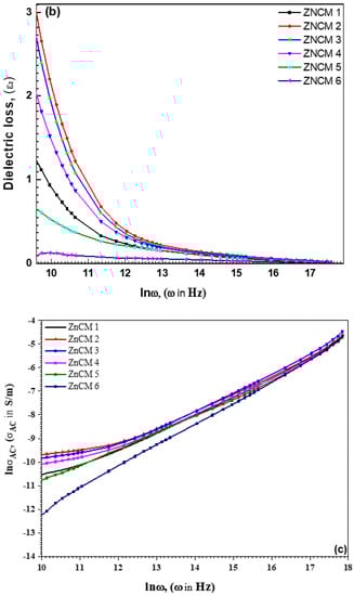 The σDC denotes direct current conductivity, B is a constant, ω is the angular frequency, and s is a frequency exponent. The dielectric constant of the present samples decreased with increasing frequency and became saturated at higher frequencies (Figure 7a). The decreasing dielectric constant is explained as a high frequency, and the dipoles do not change in response to changes in the field variations. The decrease in dielectric constant values is caused by interfacial polarization/grain boundaries [40,41]. At lower frequencies, the dielectric constants of ZNCM-1, ZNCM-2, ZNCM-3, ZNCM-4, ZNCM-5, and ZNCM-6 are in the 40–48 range. The dielectric constant is frequency-dependent throughout the frequency range. It rises dramatically as the Mo content increases and stabilizes at high frequencies without significant change, allowing current samples to be used for various microwave device applications [46,55]. The frequency dependence of the dielectric loss with various concentrations of Mo is shown in Figure 7b. The dielectric loss also follows the same trend as the dielectric constant. It decreases with doping concentration at lower frequencies, indicating the dispersion phenomenon. It is worth mentioning that the dielectric constant and loss are purely dependent on Mo-doping concentration, suggesting that present samples found huge applications in microelectronic, sensors, and memory device applications. The electrical conductivity ( σ A C ) gives a different Mo concentration with frequency variation, as shown in Figure 7c. From the figure, the conductivity is increasing with increasing frequency. The increase in conductivity suggests the clear influence of Mo doping in ZnO nanoparticles.