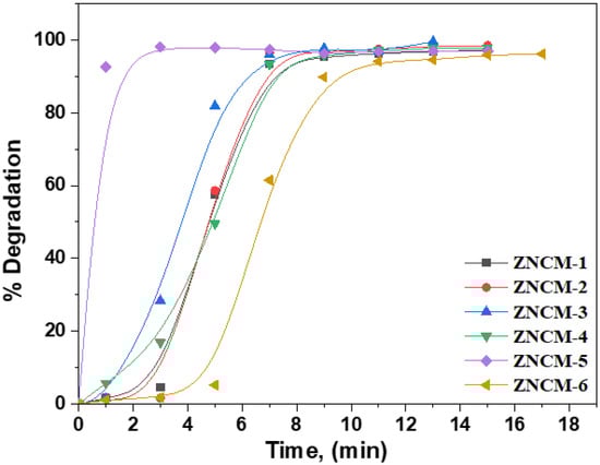 Figure 9. The % of EC degradation of RhB in the presence of ZNCM nanoparticles.