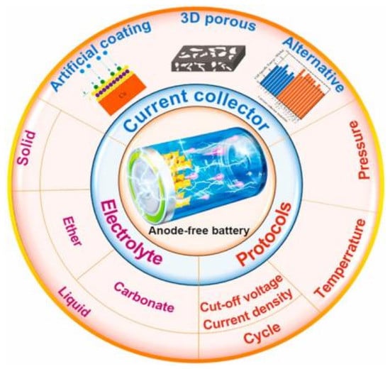 LIBs are mainly designed in configurations such as Cu/C6/PP/LiXO/Al arrangements, where Al and Cu represent the current collectors, and C6 is used as the graphite anode. In terms of energy storage capacity, PP denotes the separator from polymer materials, while LiXO represents the lithiated oxide cathode, e.g., LCO, LMO, NCA, and LFP. Lithium metal shows excellent performance with advantages such as being lightweight, providing an excellent specific capacity, and showing a high negative standard potential window compared with other anode materials. Furthermore, lithium-ion batteries using lithium metal as the anode could provide excellent electrochemical performance with a higher potential window than the graphite anode by about 0.1 V, while the energy density can also be improved [19]. However, the formation of dendrites during the charge–discharge processes decreases the columbic efficiency. A parasitic reaction with the surrounding electrolytes mostly happens in the batteries during charging and discharging via the organic electrolyte. Anodes with greater Li metal excess have recently been used in many areas. Nevertheless, the attained specific capacity is not satisfactory [11]. Several techniques have been developed to improve the coulombic efficiency and enhance the life cycling of anode-free batteries. Figure 1 summarizes the recent studies, including optimization of the electrolyte and current collector, as well as design of the most favorable protocols.