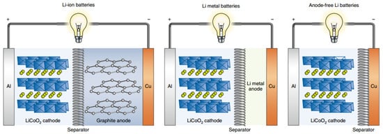 Meanwhile, lithium metal plays an important role in the structure of advanced lithium–sulfur batteries and lithium–oxygen batteries. They all have some common defects, including low coulombic efficiency, poor rate reversibility, thermal runaway, and other safety issues due to lithium dendrites, which can cause depletion, undesirable side reactions, and short-circuits [13,14,15]. To improve the LMB performance, many researchers have developed state-of-the-art optimization procedures and systematically studied the intrinsic regulation principles for better lithium anode stability, according to the recent literature [16,17,18]. However, the attained specific capacity is still a problem [11]. In order to improve the coulombic efficiency and enhance the life cycling of batteries, the concept of anode-free batteries was proposed, whereby the material on the surface of the current collector is very thin or there are self-assembled materials without a current collector. Not only does the battery have only a cathode, but it is organized in a different manner compared to Li-ion and Li-metal batteries.