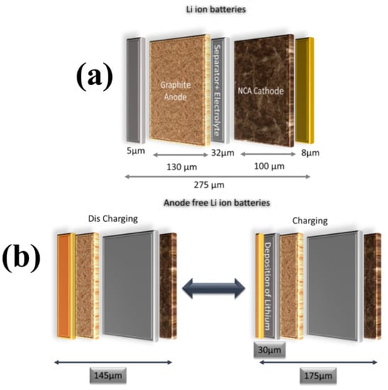 Schematic diagram of the loading of LIBs featuring an NCA (lithium–nickel–cobalt–aluminum oxide) cathode system with a thickness of 100 µm. (a) Schematic illustration of an example lithium-ion battery using an NCA cathode of thickness 100 µm and a loading of 30.5 mg·cm−2, drawn to scale. (b) Schematic illustration of an anode-free full cell using an equivalent NCA cathode, in both charged and discharged states. The difference in energy density can be clearly visualized. There is a ~20% volume change associated with the plating and stripping of lithium, which will have to be accommodated (modified from [30]).