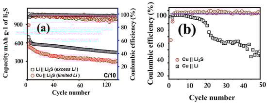 (a) Electrochemical performance of Li||Li2S half battery and anode-free Cu||Li2S battery, with a 4 mg·cm−2 cathode. (b) Coulombic efficiencies of plating and stripping lithium on Cu foil from Li2S cathode and lithium-metal counter electrode (modified and adopted from [42]).