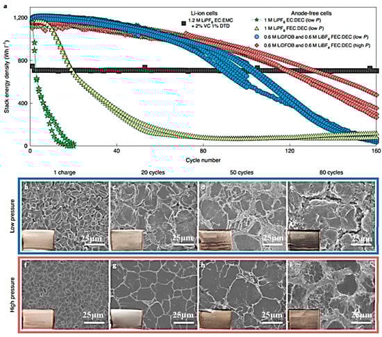 (a) Comparison of anode-free and Li-ion cells with different electrolytes. (b–i) SEM images of plated lithium at different pressure after different charging cycles.Scale bars 25 μm [74].
