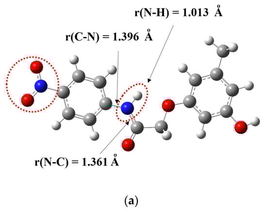 The molecular configuration of B1 was stabilized by the intramolecular H-bonding of C=O…H, displayed in Figure 3. The molecules were linked to each other through C=O…H–O bonding by the carbonyl of amide and the hydroxy group from the methoxy phenol ring. Furthermore, the molecules were also connected by N–H…O–N–O, in which the hydrogen atom of amide is bound to the oxygen of the nitro-substituted group.