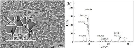Microstructure of dual-phase titanium alloy: (a) SEM; (b) XRD.