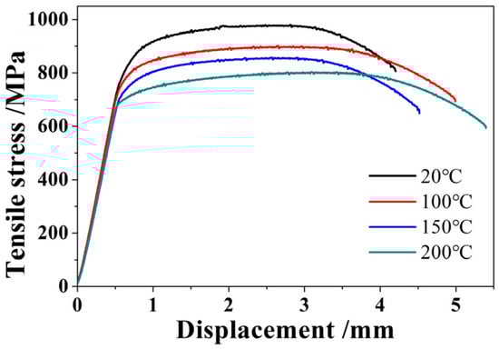 In the range of room temperature (20 °C) to 200 °C, the tensile curves of Al-Zr-Mo-Cr titanium alloy are shown in Figure 3, respectively. There is no obvious yield platform in the tensile curve. At 20–150 °C, it presents a smooth curve from elastic stage to plastic stage. At 200 °C, there is an obvious yield point after the elastic stage, and the yield platform does not appear. Due to the increase in temperature, the strength of the material shows a downward trend, The increase in temperature usually increases the elongation of the tensile test for plastic materials. It is worth noting that the test results of Al-Zr-Mo-Cr titanium alloy show abnormal characteristics. Then, the elongation of the material in the tensile results at 150 °C is significantly lower than that at 100 °C.