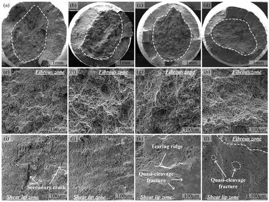 The radiation region is not observed between the fiber region and the shear lip region, which indicates that there is no transition from stable crack growth to rapid unstable crack growth, and the crack growth rate increases suddenly from the fiber source region to the shear lip region. The fracture characteristics of the fiber source region under different temperature conditions are shown in Figure 5e–h. The fiber source region presents ductile fracture characteristics, which is a typical microvoid polymerization fracture. The increase in temperature has no obvious effect on the ductile fracture process, and the diameter of the dimple of all fractures is 8–15 μm for different temperature conditions.