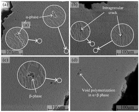 Void damage is the main cause of stress concentration in the local area of the microstructure. At 20 °C, the microstructure of the fracture section is shown in Figure 6a, and all voids are formed in the α-phase, and microcracks first form from the cavity position of the α-phase and gradually expand to form dimple characteristics. When the temperature is 100 °C, transcrystalline microcracks formed by voids in the adjacent α-phase are observed, and the position of voids is still present in the α-phase. Then, the voids in the β-phase of the fracture section are observed when the temperature increases to 150 °C. It can be inferred that the cracking characteristics of the β-phase change when the temperature increases, and it is easier to form voids. Under this condition, α-phase and β-phase voids appearing in both phases, which reduce the statistical expectation of the distance between two adjacent voids, and it is easier to cause normal-stress fracture between two short-distance voids, rather than ductile fracture. Therefore, the fracture characteristics of quasi cleavage fracture are formed. When the temperature is further increased to 200 °C, the number of voids in the α-phase and β-phase increases significantly, which forms void aggregation, and then reduces the normal stress between adjacent short-distance voids, so the number and area of quasi-cleavage features at this temperature decrease.