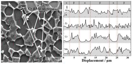 The material contains four main alloy elements: Al, Zr, Cr and Mo, and its microstructure is scanned by energy-dispersive spectroscopy (EDS) analysis with a line, as shown on the left side of Figure 7. The dark color and sunken part are the α-phase, the light color and prominent part are the β-phase, and the distribution results of solid-solution elements in different phases are shown on the right side of Figure 7. EDS results show that Al and Zr are evenly distributed in the α-phase and β-phase, and there is no obvious segregation; however, both Cr and Mo elements have obvious segregation in the β-phase, and the content of Cr and Mo elements in the α-phase is low.