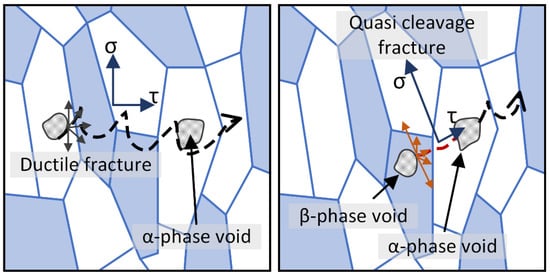 In other words, the appearance of β-phase voids is the inducement of fracture mechanism transformation. Firstly, due to the temperature increase, the void in the β-phase can be formed during deformation. Secondly, for the case where there are voids in both the α-phase and β-phase, the expected distance between voids is smaller than that in the case where only the α-phase has voids, and it is easier to achieve the conditions for inducing quasi-cleavage fracture, thus changing the fracture process.