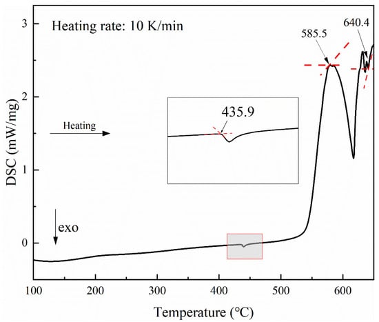 The 3 vol.% TiB2/Mg-4Al-1.5Si composites were fabricated by semi-solid stirring assisted ultrasonic treatment, and the semi-solid temperature was selected based on results from differential thermal analysis (DTA) on a thermal analyzer (STA 499 F3, NETZSCH). Figure 1 depicts the DTA profile of the as-cast Mg-4Al-1.5Si alloys, and it can be seen that there are three exothermic peaks, corresponding to the melting of ternary eutectic α-Mg + Mg17Al12 + Mg2Si (at 435.9 °C), binary eutectic α-Mg + Mg2Si (at 585.5 °C), and primary Mg2Si (at 640.4 °C) [17]. Hence, the stirring temperature was selected between 585.5 and 640.4 °C. Figure 2 illustrates the main two steps in fabricating the composites. After Mg-4Al-1.5Si magnesium alloy was melt completely at 720 °C, the melt was cooled to 635 °C in the semi-solid state, and 3 vol.% TiB2 particles (with an average diameter of 50 nm, obtained from Shanghai Xiangtian Nanomaterials Co., Ltd. Shanghai, China.) preheated to 635 °C were added to the melt, while the melt was mechanically stirred at 600 rpm, thereby incorporating and dispersing the TiB2 particles into the melt under its high viscous force in the semi-solid state. After the mechanical stirring for 5 min, the melt was reheated to 720 °C, and processed by supersonic treatment with a power of 1.8 kW and a frequency of 20 kHz. Under the acoustic cavitation and acoustic streaming induce by ultrasonic waves, the TiB2 particles were further dispersed throughout the melt. After the supersonic treatment for 20 min, the mixed melt was poured into a cylindrical steel permanent mold. The melting, mechanical stirring, and ultrasonic treatment were carried out in an Argon atmosphere to prevent the burning of the alloy melt. The specimens for solution treatment were cut from the center of the obtained cast ingot 75 mm from the bottom. Solution treatment was carried out in a chambered resistance furnace (SX2-5-12A). Generally, the upper limit temperature of solution treatment is the incipient melting temperature of the low melting point phase, to prevent the partial remelting of the Mg-4Al-1.5Si alloy during the solution treatment, the solution temperature should be lower than the incipient melting temperature of the Mg-4Al-1.5Si alloy. According to the differential thermal analysis (DTA) profiles of the as-cast Mg-4Al-1.5Si alloys (see Figure 1), the incipient melting temperature of the alloys is 435.9 °C. By referring to other similar research [34,35], the solution conditions were selected as 420 °C for 24 h, followed by quenching in cold water. To prevent the oxidation of the composites during the heat treatment process, the specimens were covered by graphite powder.