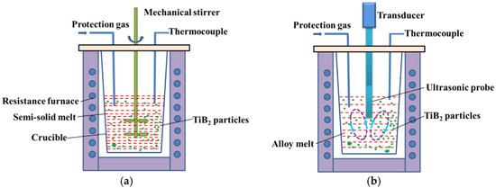 Schematic of the fabrication process of TiB2/ Mg-4Al-1.5Si alloy composites, (a) mechanical stirring in semi-solid state, (b) ultrasonic treatment in the liquid state.