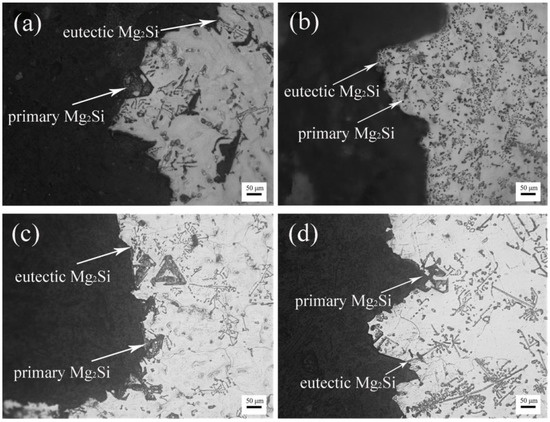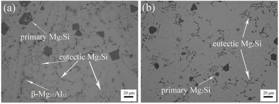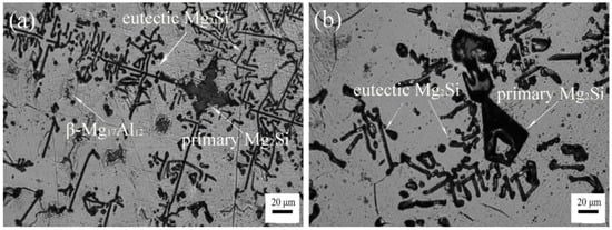 As the lightest structural metal material, magnesium alloy has great prospects for application in the fields of automobile, aerospace, and weapon industry owing to its high specific strength and stiffness, low coefficient of thermal expansion, and good damping performance [1,2,3]. Mg-Al series alloys are the most commercially used magnesium alloys due to their good castability, high strength, and low price. However, the β-Mg17Al12 phase with a low melting point is easy to be softened and coarsened above 120 °C, thereby deteriorating the mechanical properties of the magnesium alloys and severely restricting their large-scale applications in medium-high temperature components [4,5]. To improve the strength of Mg-Al series alloys at room and elevated temperatures, several elements with low solid solubility in Mg-Al alloys (such as Ca, Si, Mn, rare earth elements, etc.) were added to form secondary phases with high thermal stability [6,7,8]. The intermetallic Mg2Si phase has a high melting point (1085 °C), high hardness (4.5 × 109 N/m2), high elastic modulus (120 GPa), low coefficient of thermal expansion (7.5 × 10−6 K−1), and similar density to magnesium (1.99 g/cm3), thus low-cost Mg-A1-Si series magnesium alloys are developed by adding Si to Mg-Al alloys [9,10]. The fine Mg2Si phases dispersed at grain boundaries can hinder grain boundary sliding and improve strength. However, the eutectic Mg2Si phases in as-cast Mg-Al-Si alloys generally exhibit undesirable coarse Chinese scripts, when the Si content is high, the coarse dendritic primary Mg2Si phases will appear, split the matrix of Mg-Al-Si alloys, and break or debond under loading, thereby deteriorating the strength and ductility of the alloys [11,12,13]. Therefore, it is critical to refine and modify the Mg2Si phases for improving the comprehensive mechanical properties of Mg-Al-Si series magnesium alloys.