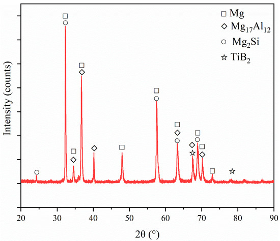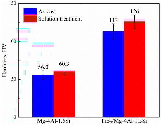 Figure 3 shows the optical microstructure of the as-cast and solution-treated TiB2/Mg-4Al-1.5Si composites. Figure 4 shows the X-ray diffraction (XRD) pattern of the as-cast composites, it can be seen that α-Mg (2θ: 32.19–72.49°), β-Mg17Al12 (2θ: 24.78–69.35°), Mg2Si (2θ: 33.93–70.18°), and TiB2 (2θ: 68.13–78.64°) were detected, and the peaks corresponding to TiB2 were not visible due to its relatively low content (3 vol.%). Hence, the microstructure of the as-cast TiB2/Mg-4Al-1.5Si composites consist of α-Mg, a small amount of island-like β-Mg17Al12 phases at grain boundaries, polygonal primary Mg2Si phases, thin Chinese script and short strip-shaped eutectic Mg2Si phases (as shown in Figure 3a). After the solution treatment, the β-Mg17Al12 along the grain boundaries of the composites was dissolved almost completely, and the morphology and size of the primary Mg2Si phases remained unchanged, but the corner became obtuse, partial branches of the eutectic Mg2Si phases were decomposed into disconnected particles, as shown in Figure 3b).
