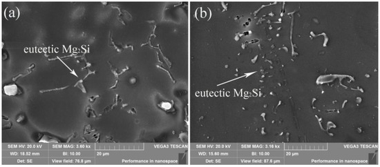 The increase of hardness and strength of the composites and the alloys after the solution treatment is mainly due to the refined eutectic Mg2Si particles, and the primary Mg2Si particles with passivated corners effectively pined grain boundaries and hindered dislocation motion and improved the hardness and strength of the composites based on the load transfer mechanism [35]. In addition, the β-Mg17Al12 phases were dissolved into the α-Mg matrix (as shown in Figure 3b) to form the supersaturated solid solution, playing the role of solid solution strengthening [39]. The more significant strengthening effect of solution treatment for the composites in terms of hardness, UTS, and YS was mainly due to the branches of the eutectic Mg2Si phases in the Mg-4Al-1.5Si alloys were partially dissolved into fragments, while the trunks remained long rod-like after the solution treatment, and the primary Mg2Si phases were still coarse and irregular, as shown in Figure 12. On the other hand, the Mg2Si phases in the composites were significantly refined by the addition of TiB2 particles compared with that in the monolithic alloys, and the fine and discrete Mg2Si blocks have more edges and corners, where Si concentration is higher and more prone to be preferentially dissolved [26,27], hence most of the Mg2Si phases in the solution-treated composites exhibited passivated particles or short rods. The addition of the TiB2 particles may promote the Si diffusion during the solution treatment, hence contributing to a better modification effect on the Mg2Si phases in the composites as shown in Figure 5b, but more investigations are needed in the future.