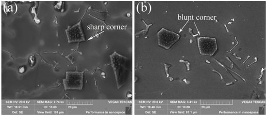 Figure 6 shows the magnified SEM micrographs of the primary Mg2Si phases in the TiB2/Mg-4Al-1.5Si composites before and after solution treatment. As shown in Figure 6a, the primary Mg2Si phases in the as-cast composites exhibit irregular polygons with sharp corners, and some eutectic Mg2Si phases are connected with them or distributed around them. After solution treatment, the primary Mg2Si is still irregular and polygon-like, but the sharp corners became obtuse, and the eutectic Mg2Si phases connected with the primary Mg2Si phases were dissolved, as shown in Figure 6b. It is concluded that solution treatment can contribute to the breakage of the eutectic Mg2Si phases and can promote the passivation of the sharp corners of the primary Mg2Si phases.