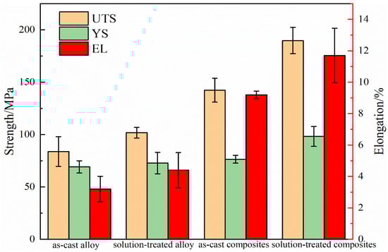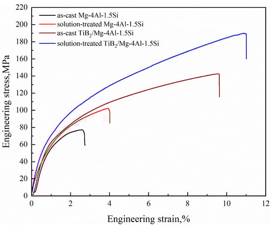 Figure 7 shows the Vickers-hardness of the alloy and the composites in the as-cast state and after solution treatment. It is seen that the hardness of the alloy and composites after solution treatment is HV 60.3 and HV 126, respectively, which is 7.7% and 11.5% higher than that in the as-cast state. Figure 8 plots the typical engineering stress-strain curves of the alloy and composites before and after solution treatment at room temperature, and the corresponding ultimate tensile strength (UTS), yield strength (YS), and elongation (EL) are listed in Figure 9 and Table 1. It can be seen that the UTS, YS, and EL of the solution-treated alloy were increased by 21.5%, 5.4%, and 37.5%, respectively compared with the as-cast alloy, while the UTS, YS, and EL of the composites were increased by 33.3%, 28.5%, and 27.2%, respectively compared with the as-cast composites. Hence, it is concluded that solution treatment was capable of improving the strength and ductility of the Mg-4Al-1.5Si alloy and TiB2/Mg-4Al-1.5Si composites, and the strengthening effect of the solution treatment is more significant for the composites in terms of hardness, UTS, and YS.