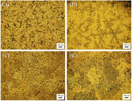 Optical micrographs showing the grain structure of the as-cast alloys (a); solution-treated alloys (b); as-cast composites (c); and solution-treated composites (d).