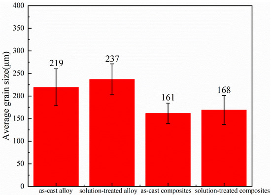 Both the as-cast and solution-treated composites exhibit superior strength and ductility over the monolithic alloys, and it is mainly due to the refinement of the Mg2Si phase and α-Mg grains by the addition of dispersed TiB2 particles, which was confirmed by the EDS mapping of Ti and B in our previous studies [25]. Figure 10 and Figure 11 illustrate the grain structure of the as-cast alloys and the composites, and it can be seen from Figure 10a,c that the α-Mg grains in the composites was obviously refined, and the average grain size was decreased by 32.1% compared with the as-cast alloys, thereby contributing to the increase in hardness and strength based on grain refinement strengthening mechanism [37]. During the solution treatment, the α-Mg grain of both the alloys the composites grew slightly, and the size rise was 8.2% and 4.3%, respectively, indicating that the Mg2Si phases and the TiB2 particles inhibited grain growth to a certain extent during the solution treatment [38], but the refined Mg2Si phases (green particles as shown in Figure 10d) together with the TiB2 particles have more significant inhibition effect on the α-Mg grain growth compared with the coarse Mg2Si phases (as shown in Figure 10b). Hence, the composites still owned super mechanical properties than the alloys even after the solution treatment.