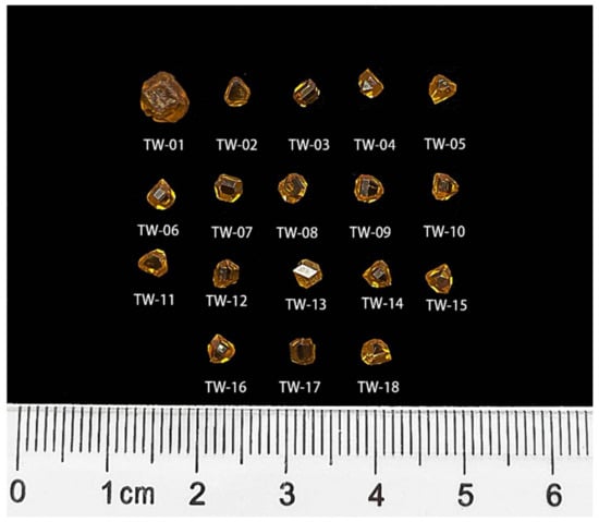 A total of 18 diamond crystals with contact twinning synthesized by high temperature and high pressure were provided by Zhengzhou Sino-Crystal Diamond Co., Ltd., Zhengzhou, China. They were labeled as TW-01~TW-18, respectively (Figure 1). The synthetic pressure and temperature were 5.4 ± 0.2 Gpa and 1350 ± 10 °C, respectively. The color of the samples was brownish yellow due to the presence of nitrogen in the growth process. High-purity titanium metal was used to obtain nitrogen during the diamond-crystallization process. High-purity graphite powder (99.99%) and an iron-nickel alloy were used as the carbon source and solvent, respectively. Among the samples, the largest one, TW-01, weighed 1.021 ct, while the others, TW-02~TW-18, weighed between 0.1655 ct–0.231 ct. The crystal morphology was different from the traditional HPHT synthetic-diamond products, which are cube-octahedral structures. All of the samples presented a symmetrical crystal morphology. It could be observed that they all had a re-entrant angle, which is a feature of twinning, and that the orientation of the same crystal plane on both sides of the twin boundary changed; therefore, the samples were very rare. In order to discuss their morphological and surface microtopographic features and further explore their causes, varieties of observation techniques were used to produce the analysis of the morphology features of HPHT-grown synthetic diamonds with contact twinning.