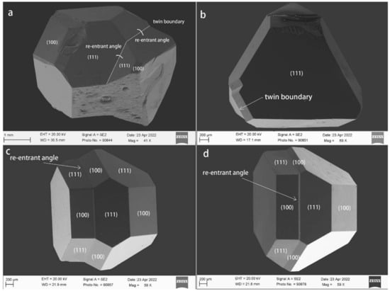 Observing the macroscopic morphology of synthetic-diamond contact twinning TW-01, TW-04, TW-07, and TW-12 by the SEM, the contact relationship of the crystal plane was expressed more clearly. As shown in Figure 3a, crystal domains share a common {111} plane, which are offset from one another to create surface faceting with re-entrant angles. Arising from the differences in the number and development of the {100} and {111} growth sectors on either side of the twin boundary, the degree of crystal symmetry is varying. Figure 3b shows that the sample has features of crystal morphology similar to octahedral Macle in natural diamonds. Macle crystal is the fattened octahedral crystals that are connected along an octahedral plane, with one of the crystals being oriented in the opposite direction. This orientation can be viewed as one crystal being rotated in the contact plane by 180º with respect to the other crystal. The morphology bounded only by (111) faces which grow by the layer-by-layer [18,19]. Finally, due to the resorption, Macle crystals can convert into flattened dodecahedral diamonds [2,20]. The difference is that HPHT synthetically grown diamond crystals with contact twinning do not undergo the flattening process. The morphology of twinning is clear to distinguish. As shown in Figure 3c,d, the single crystal of twining makes contacts with the planes of (100) and (111). Additionally, the twin boundary seems to be a certain width. The single crystal still has the features of a tower shape.