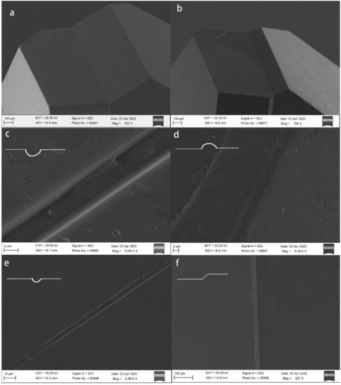 The formation of a twin boundary is often accompanied by the appearance of re-entrant angles. In the current study, three basic appearances of these twin boundaries were observed: (i) The contact twinning domains shared a common {111} plane. The intersecting lines of two single crystal (111) planes formed the twin boundary (Figure 3a). (ii) The single crystal of twining makes contact with the planes of (100) and (111), and it seemed to be a certain width of the twin boundary (Figure 3c,d). (iii) The twin boundary was not always continuous and was sometimes blocked by other small facets (Figure 2f). Grain boundaries can be divided into coherent and incoherent factors. The only coherent boundary between the crystal and twin is the (111) plane. Consequently, the twin boundary of (111) contact twinning in diamonds is coherent, which can be observed as linear features by gemological microscopy [21]. When the twin boundary was observed by SEM, it was not a sharp, straight line similar to the crystal edge, but is similar to the shape of the pipe with a different height to the crystal plane (Figure 4a–e). The twin boundary forms a zigzag structure when the twining contacts the planes of (100) and (111) (Figure 4f).