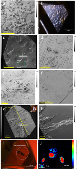 - Fedortchouk, Y. A new approach to understanding diamond surface features based on a review of experimental and natural diamond studies. Earth-Sci. Rev. 2019, 193, 45–65. [Google Scholar] [CrossRef]
