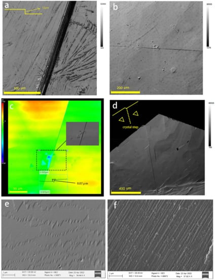 Many typical etch figures were observed in the samples. It was observed that the octahedral plane had a nearly flat surface, but the triangular, hexagonal, circular planes and their transition pits were irregularly distributed on it (Figure 5a). They could also cover the whole crystal plane, similar to the fish-scale pattern (Figure 5b). The circular pits did not exist isolated, but were often linked to others (Figure 5c). Some etch pits showed that the point-bottomed different origin compared to the flat-bottomed origin, which, due to the surface defects and foreign particles, caused the of formation for point-bottomed etch pits, presented mixed edges, screw dislocations, or edge dislocations (Figure 5d,e) [30]. Further observations showed that a large number of dense, tiny triangles, which originate from the point defects, were distributed on the {111} plane (Figure 5f). The features of the etch pits revealed that there was a sequence etch process on the octahedral faces. The initial stage of the crystal was etched. Small, triangular etch pits developed, then they became larger and deeper. When the rate of etching increased, the morphology features changed into rounded shapes, then these etch pits could ultimately link to each other [27,30,31,32,33].