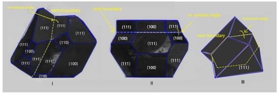 When a crystal is made up of parts that are oriented with respect to one another, according to some symmetry rules, the crystal is said to be twinned. The common symmetry rule of twinning is reflection rotation and inversion. The formation of twin crystals is a kind of deformation. Diamond twins are only generated during the growth process [5,41]. Compared to the natural diamond, twinning in synthetic diamonds is rare. It may be caused by the following factors. HPHT synthetically grown diamonds with rapid growth rates produce more uncertainty about the location of the carbon atoms’ deposition and crystallization. The twinning crystal could form and extend into the inner crystal from the twin nucleus formed in the nucleation process [42], which has a considerable contingency.