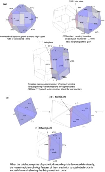 In order to visualize the formation process of HPHT synthetically grown diamonds with contact twinning, crystal modeling was built as shown in Figure 8. It can be concluded that types of I and II conform to the model (A). The common crystal morphology of HPHT synthetically grown diamond is cubic-octahedral. When the contact twinning forms, the single crystal rotates 180° along the <111> axis. Additionally, the twin plane is (111). Due to the number and development of the {100} and {111} growth sectors on either side of the twin boundary being different, the symmetry of tower crystals is different. When the octahedron plane of the HPHT synthetically grown diamond crystals were developed, such as type III, they conformed to model (B). The macroscopic morphology feature of contact twinning shows similar features to Macle in natural diamonds.