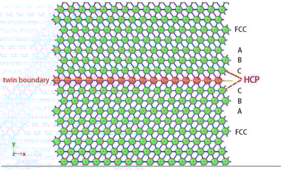 Combined with the features of etch figures on the crystal plane, there was no obvious crystallography discipline on either side of the twin boundary, which indicates that the development of the {100} and {111} growth sectors on either side of such boundaries seems to proceed independently [17]. The crystallography of twinning is the same, irrespective of the way twins are produced [41]. The normal arrangement of carbon atom layer in a face-centered cubic (FCC) lattice is ABCABC…, but in the contact twinning formation, the carbon atom layer slides along the <121> and the Burgers Vectors is B = a/6 [112] [43]. The arrangement of carbon atom layers is mirror symmetry as shown in Figure 9. From the analysis of the theoretical model of atomic arrangement, the type of lattice at the twin boundary is a hexagonal close-packed (HCP) structure. A previous study determined that the hardness of diamonds can be enhanced by the formation of twin structures, and the ideal indentation strength of a hexagonal diamond surpasses that of a cubic diamond by 58% through the longitudinal sound speeds, which means that the hardness of diamonds with hexagonal close-packed structures increased by more than half [13,44]. Consequently, the contact twinning in HPHT synthetically grown diamonds should have the physical properties of hexagonal diamonds at the position of the twin boundary.