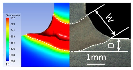 The experimentally determined weld cross sections were compared with the corresponding calculated geometries as shown in Figure 2. In the experimental results, the W was about 1.9 mm and the D was 0.8 mm. It was found that the weld profiles were in agreement between the experiment and numerical simulation.