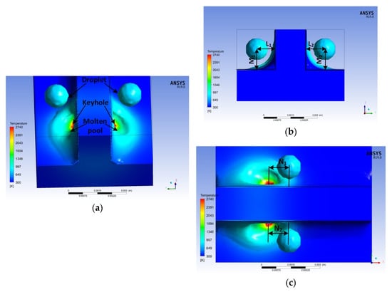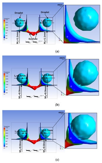 Figure 4 shows the three-dimensional morphology of the droplet filling mode during DSLBW of T-joints. As shown in Figure 4a, L1 = L2 = 1.0 mm, M1 = M2 = 1.1 mm, and the droplet filling mode was a free transition. As shown in Figure 4b, L1 = L2 = 0.8 mm, M1 = M2 = 0.9 mm, and the droplet filling mode was a slight contact transition. As shown in Figure 4c, L1 = L2 = 0.7 mm, M1 = M2 = 0.8 mm, and the droplet filling mode was a contact transition.