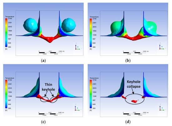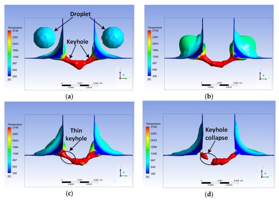The keyhole shape with free transition of the droplet during DSLBW of T-joints: (a) t = 12.0 ms, (b) t = 15.2 ms, (c) t = 15.8 ms, (d) t = 16.2 ms.