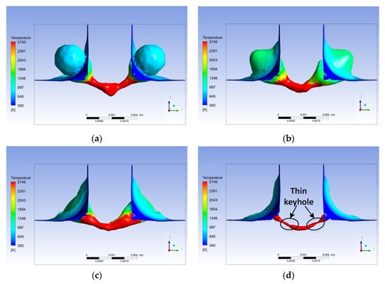 The keyhole shape with slight contact transition of the droplet during DSLBW of T-joints: (a) t = 12.0 ms, (b) t = 13.4 ms, (c) t = 14.0 ms, (d) t = 14.2 ms.