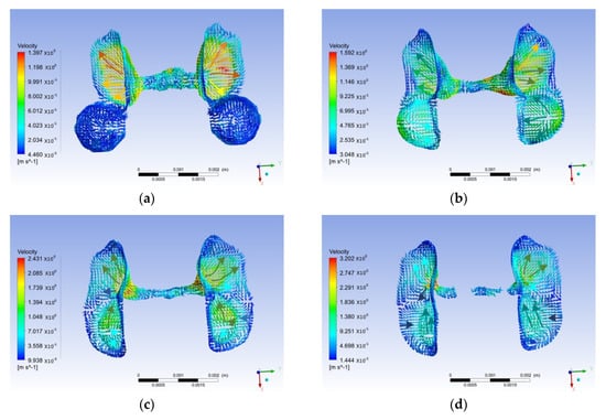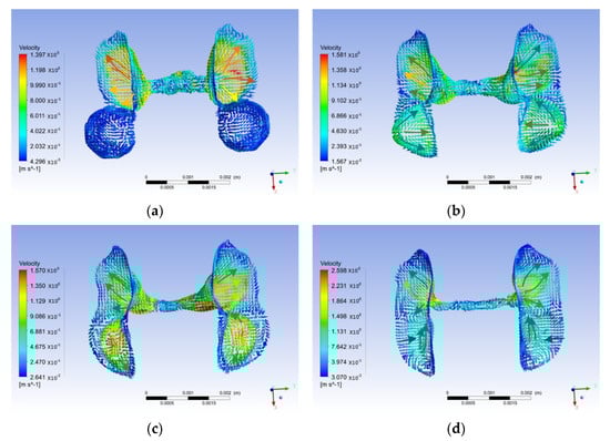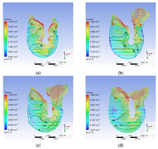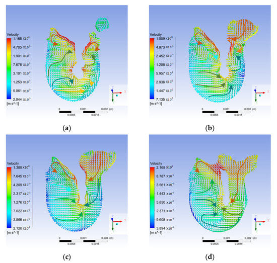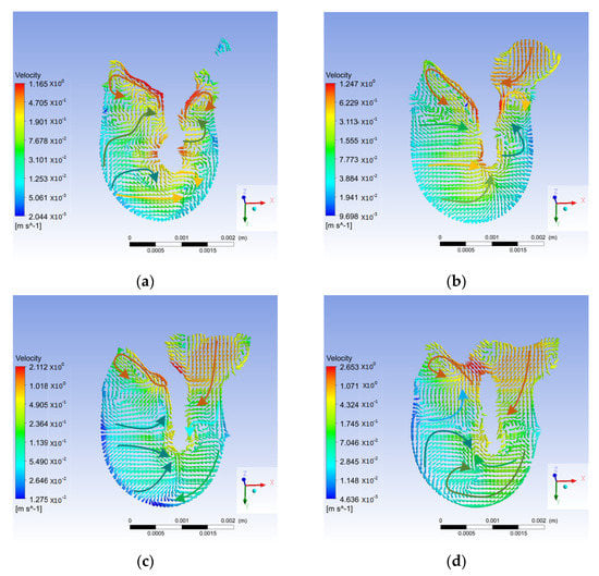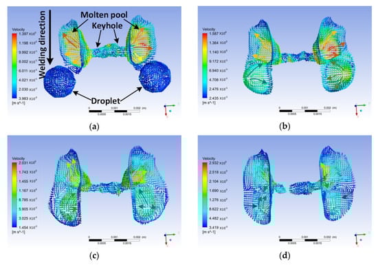 At the early stage of the droplet entering the molten pool, the flow vortex caused by the Marangoni-driven flow appeared in the front and the rear of the keyhole opening in the longitudinal section of the molten pool, as shown in Figure 12a,b, Figure 13a,b and Figure 14a,b. At the later stage of the droplet entering the molten pool, the flow vortex caused by the Ma-rangoni-driven flow disappeared in front of the keyhole opening in the longitudinal sec-tion of the molten pool, as shown in Figure 12d, Figure 13d and Figure 14d.