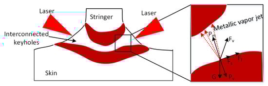 The pressure on the keyhole wall during the DSLBW process for T-joints is shown in Figure 15. The pressures acting on the wall of the keyhole included friction force (Ff), hydrostatic pressure (Pm), recoil pressure (Pv), surface tension (Fs), and hydrodynamic pressure (Fv). In the process of the DSLBW, the keyhole was relatively stable when it was in dynamic equilibrium. By using a high-speed camera, Tao et al. [] studied the influence of the welding wire on the weld pool during the DSLBW process for T-joints. They found that the mode by which the filler wire entered the molten pool after melting had an effect on the weld porosity. When the front end of the filler wire was melted and the liquid metal entered the molten pool via contact transition, the porosity of the weld was low. In our paper, during the later stage of the droplet entering the molten pool via contact transition, the middle-upper part of the interconnected keyholes became thinner but did not collapse. When the keyhole was less prone to collapse, the weld porosity was lower. However, when the droplet entered the molten pool via free transition or slight contact transition, the keyhole collapsed at the later stage. This was because free transition and slight contact transition had a greater impact on the front wall of the keyhole than contact transition. Furthermore, the uniformity of the laser energy density distribution in the keyhole irradiated by the laser beam was affected, which in turn further affected the evaporation of metal elements in the keyhole. In the area irradiated by the laser beam, the vapor recoil force of metal vaporization increased. In the area that could not be irradiated by the laser beam, the vapor recoil force of the metal vaporization would be reduced, which would further cause severe fluctuation of the keyhole.