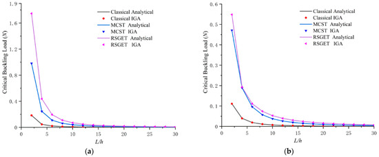Figure 2 shows the variation of critical buckling loads obtained by analytical and isogeometric analysis (IGA) of EBT and TBT based on classical theory; Figure 2 also shows MCST and RSGET for simply supported beams with different length-to-thickness ratios. The geometries are b = 2h and h = 17.6 μm, and the loading of microbeams is shown in Figure 1. The classical theory and MCST results can be obtained from RSGET by set ls = lm = 0 and ls = 0, respectively. The material–scale parameter of RSGET is assumed as ls = 1.2lm. It is shown from the figure that the IGA results matched very well with the analytical solutions for both beam problems. Additionally, the critical buckling load predicted by RSGET and MCST is always higher than that obtained by classical model, which also explains the size-dependent behavior. It can also be observed that the critical buckling load decreases as the beam length increases, which is due to a decrease in microbeam stiffness as the beam length increases.