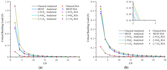 The influence of beam thickness on the critical buckling loads of EBT and TBT with different strain gradient length–scale parameters, ls, are shown in Figure 5a,b, respectively. In this example, the geometries are L = 20h and b = 2h and the material–scale parameter is lm = 17.6 μm. For both the Euler–Bernoulli and the Timoshenko beam problems, the IGA results matched very well with the analytical solutions. It shows that the critical buckling load increased as the beam thickness and strain gradient length–scale parameter, ls, increased. On the other hand, it reveals that the size-dependent behavior can be described by the present IGA approach.
