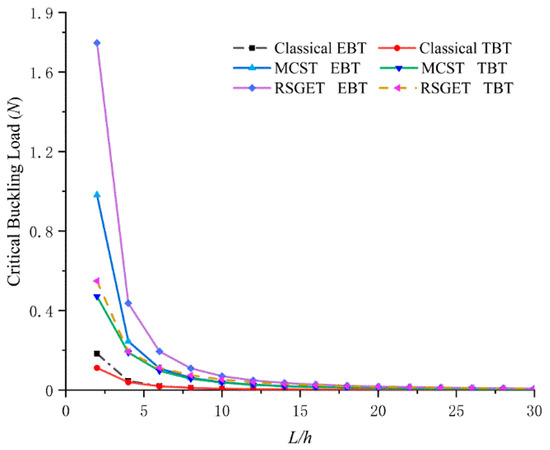 Considering the former example, Figure 3a,b shows the effect of different strain gradient length–scale parameters, ls, on critical buckling load predicted by the Euler–Bernoulli and Timoshenko theories. The differences between critical buckling load obtained by RSGET, MCST and classical theory are significant when the length-to-thickness ratio, L/h, is low. The critical buckling load increases as the strain gradient length–scale parameter, ls, increases.