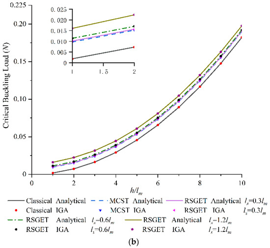 In order to show the flexibility of the IGA approach, the effect of boundary conditions on the critical buckling load of EBT and TBT based on RSGET with ls =1.2lm are presented in Figure 7a,b. The geometry in here is defined by letting L = 20h and b = 2h and the material length–scale parameter is lm = 17.6 μm. It is observed that the results obtained by clamped–clamped (c-c) boundary conditions are higher than those obtained by clamped–simply (c-s) and simply–simply (s-s) boundary conditions, respectively. Furthermore, the differences increased as the beam thickness increased. This is due to the stiffness changing with the boundary conditions, and led to the variation in critical buckling load, especially for thick beams.