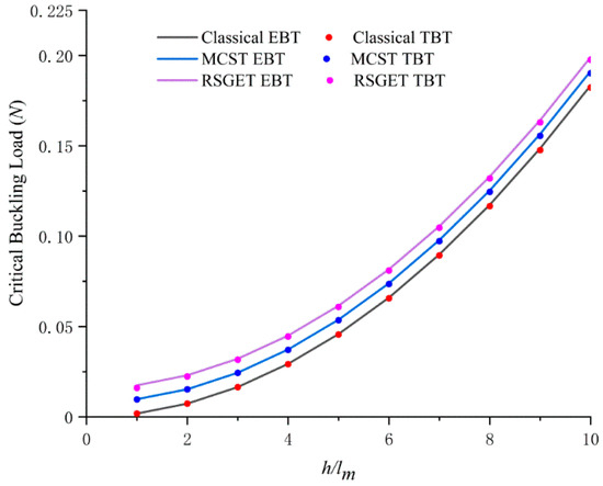 Considering the former example, the comparison of critical buckling loads, obtained by EBT and TBT based on classical theory, and the MCST and RSGET with ls = 1.2lm for different beam thickness, are shown in Figure 6. It shows that the difference between EBT and TBT is negligible for small values of beam thickness.