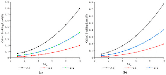 The critical buckling loads with different thickness and ls. (a) Euler–Bernoulli; (b) Timoshenko.